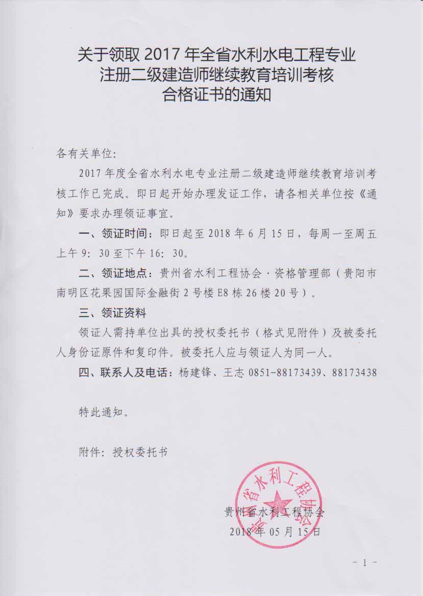 关于领取2017年全省水利水电工程专业注册二级建造师继续教育培训考核合格证书的通知